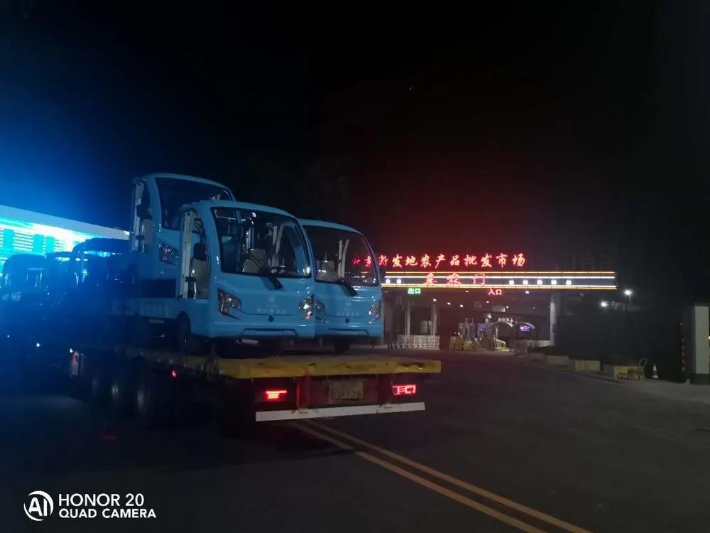 2020年8月15日早7:38,伴隨著瓜果蔬菜的芬芳,久違的新發(fā)地批發(fā)市場(chǎng)正式復(fù)市。隨之正式上崗的還有20輛綠友電動(dòng)貨斗車。