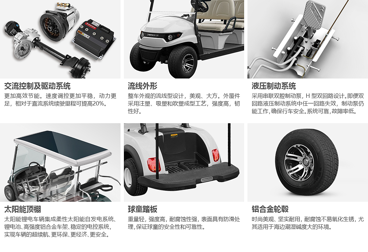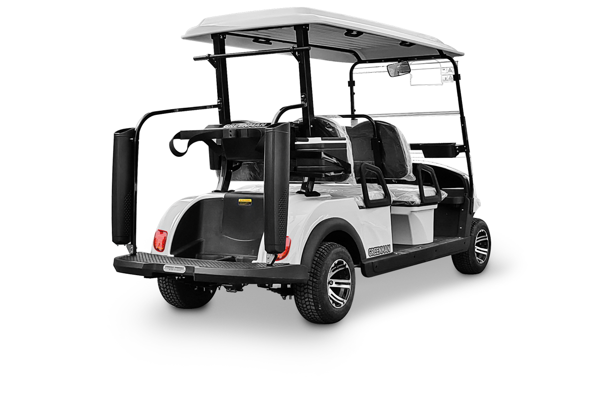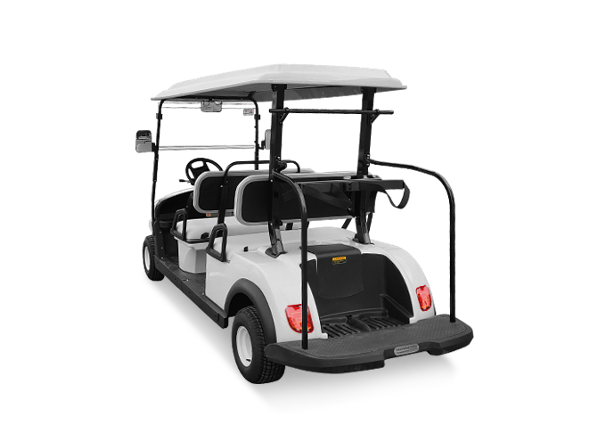 同向四座高爾夫球車,可以供4名球手和2名球童同時駕乘,也可以供3名球手和3名球童同時駕乘。